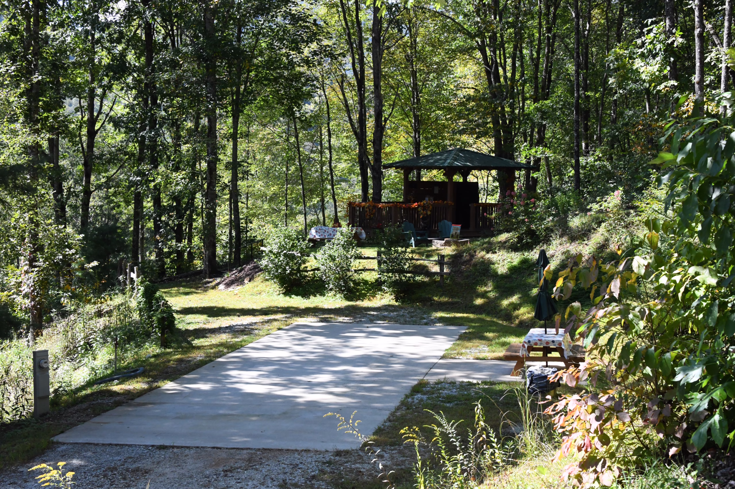 NOTICE: Site #8, “The Woods” is not designed for travel trailers or 5th wheels, as the hookups are on the opposite side. For this reason, “The Woods” is listed as a Motorhome Only site. That said, travel trailers and 5th wheels 35′ and under, can still use the site. Once parked on the pad and disconnected, simply pull your truck forward a few feet, then back it around your RV. Call or text us at (828) 349-5440 if you have questions or concerns.