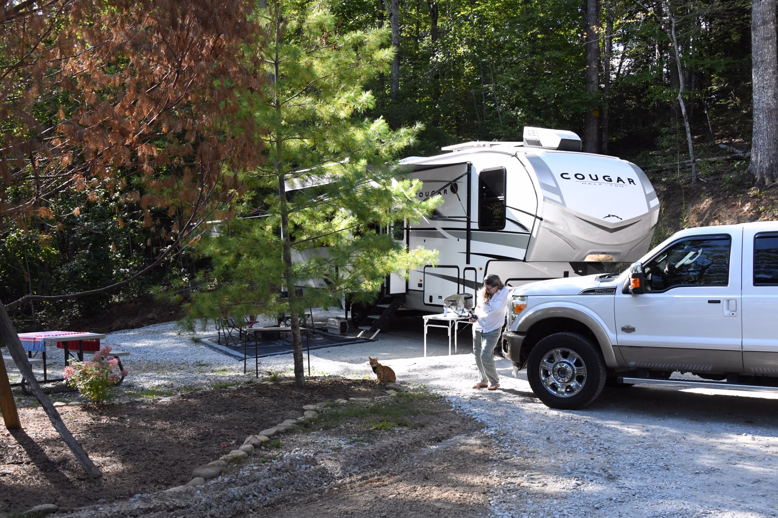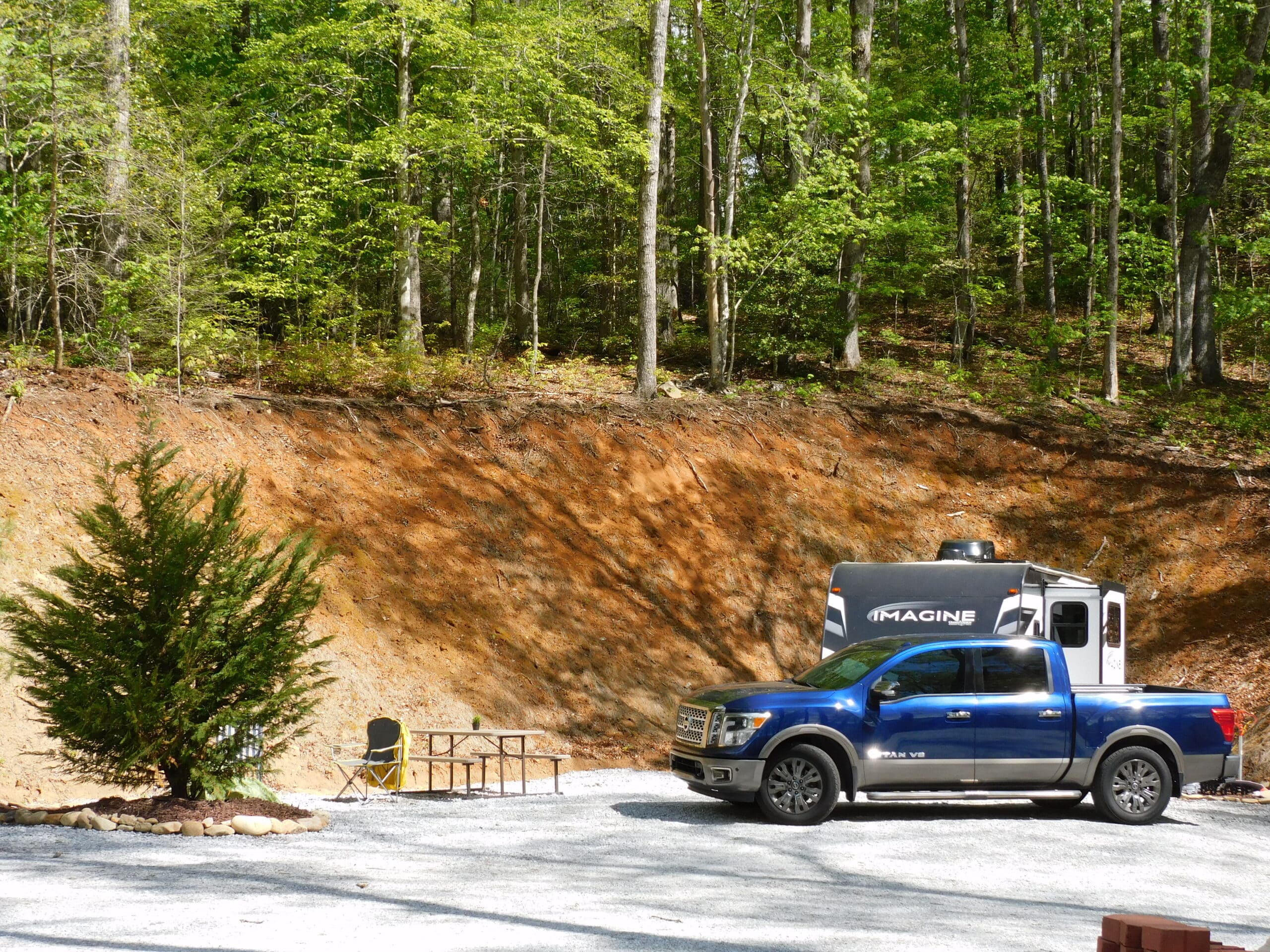 NOTICE: Site #8, “The Woods” is not designed for travel trailers or 5th wheels, as the hookups are on the opposite side. For this reason, “The Woods” is listed as a Motorhome Only site. That said, travel trailers and 5th wheels 35′ and under, can still use the site. Once parked on the pad and disconnected, simply pull your truck forward a few feet, then back it around your RV. Call or text us at (828) 349-5440 if you have questions or concerns.