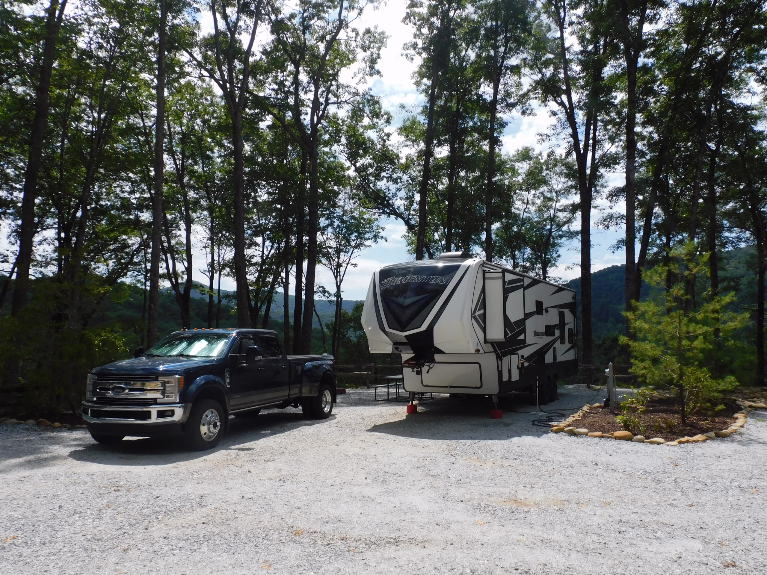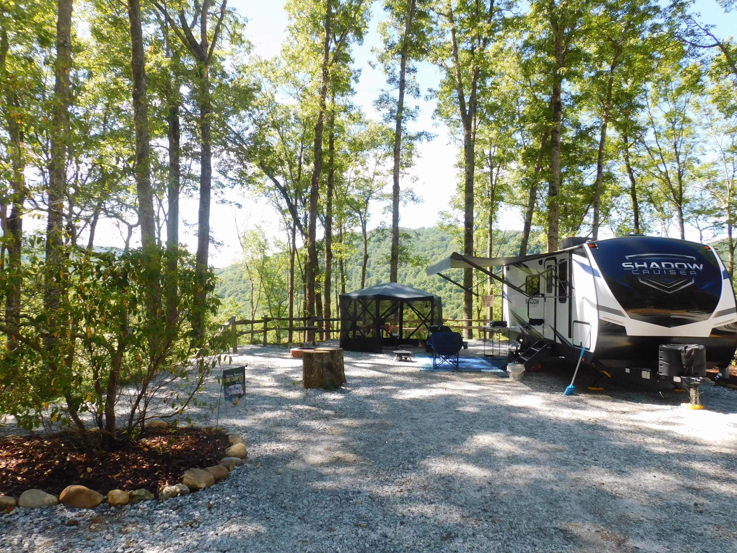 RV Camping Near Franklin NC? No better place than at Deer Springs RV Park! RV’s up to 40′ will fit comfortably in the Sunrise Sonata and there is room to park your car or golf cart on the side. Positioned thoughtfully, your RV shields the neighbor on your left, and your neighbor on the right is over 50′ away.